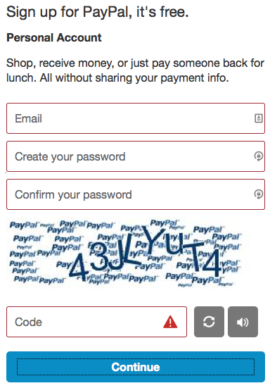 Update: It turns out that the accessibility issue described above in the PayPal example is caused by the LastPass plugin in my browser. Thanks to Tony Amidei (@subface) from PayPal for pointing this out to me. As designed, the triangle icons should always appear on fields in an error state.
