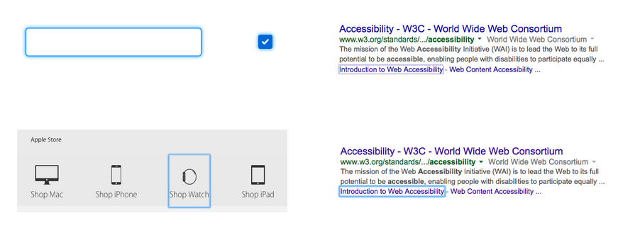As a quick exercise to experience a website that doesn’t always provide visual focus, open a tab and visit the website for the company who makes your mobile phone. Press the Tab key repeatedly to navigate through the page. Do you see a visual focus indicator as you navigate? Maybe you see this for some links on the page but not all? Consider the effect this has on someone who only uses a keyboard to interact with the web.