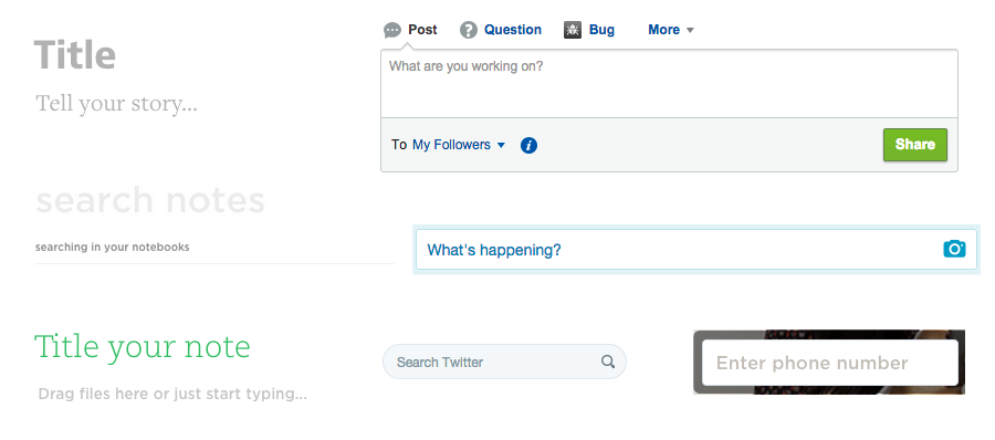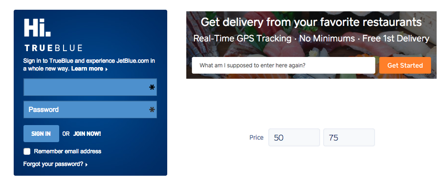 Placeholder text goes away. In the examples below, what am I supposed to enter into the text field? For the JetBlue example should I enter my username, my email address, or my TrueBlue number? For the Caviar example, should I “Get Started” by typing in my favorite food, a preferred restaurant, or my address? Are the price fields for min and max, over and under, or before and after?