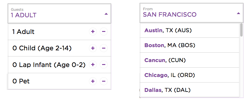 The same rule holds true for menus. In the examples below from Virgin America, while very similar visually, only the drop down on the right is an actual “menu”. The one on the left is a non-modal dialog.