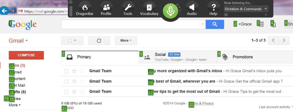 Below is a screen shot from Gmail with Dragon Naturally Speaking showing an overlay with hyperlinks identified by number. The user can now speak a number out loud and activate a link. What happens if a link isn’t visible until a region is hovered upon? We would have numbers showing next to empty spaces.