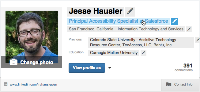 Suddenly there are visual indications that I may individually edit many of the fields on this page including my name, title, previous jobs, education and even my profile photo. Taking this one step farther, when I hover specifically over my title, the text turns blue indicating that I am ready to click.