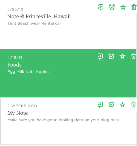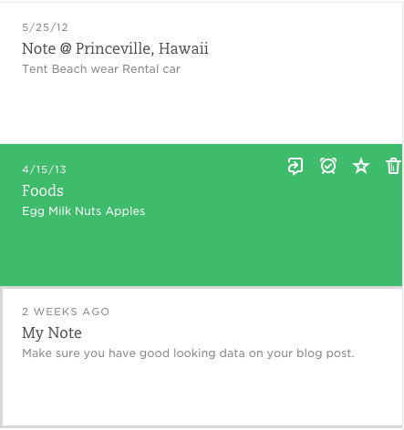 Here’s another example from Evernote. This is a list view of notes. When the user’s mouse hovers over a row, four actionable icons appear.